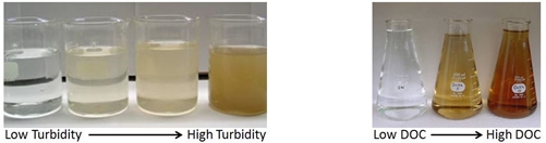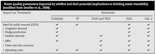 While several studies have reported wildfire impacts on some aspects of water quality, most studies have not provided adequate information to assess potential implications of wildfire on drinking water treatment because they lack appropriate water quality data (type of measurement and/or frequency of analysis). Turbidity, a measure of the cloudiness of water from suspended solids, and dissolved organic carbon (DOC) (often related to colour) are key aspects of water quality that drive the type of infrastructure needed to treat source water to produce safe drinking water.