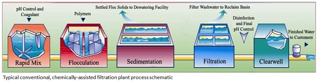 Almost all types of water quality can be treated to produce safe drinking water. The question is, “at what cost”? Water treatment plants are designed to remove suspended solids, chemicals, and pathogenic microorganisms from water. The type and number of different treatment steps that are needed to produce safe drinking water for distribution to communities depend mostly on source water quality. High quality ground and surface waters do not typically require all of the more costly treatment steps used in conventional, chemically-assisted drinking water filtration plants. They may only require disinfection (such as chlorination) or direct filtration without sedimentation, and possibly without flocculation. All drinking water from the tap must meet provincial water quality criteria to be deemed safe for consumption.