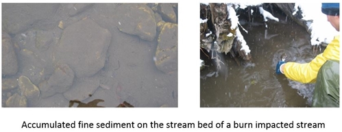 Higher stream flow is required to erode wildfire impacted sediment into the water column than in unburned streams, but more sediment is eroded from burned streams at higher streamflows. This was because sediment from burned streams had greater biological activity which resulted in deep and more widespread biofilm formation along burned stream beds compared to unburned stream beds. Biofilms hold sediments together, stabilizing stream beds. However, at higher stream flows (during snow melt, stormflow events), erosion depths were 25 to 100 times greater in sediment deposits of fire impacted streams, eroding more sediment. Similar work is being conducted in the Elbow River to document intrusion fine sediments into riverbed to predict the long-term storage and periodic transport of these sediments downstream into the Glenmore reservoir in Calgary.