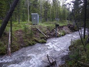 Streamflow is monitored across a broad network of hydrometric stream gauging stations using standard stream stage-discharge relationships at all of our research sites. Manual streamflow measurements are conducted with standard area-velocity techniques using flow velocity meters. Current metering is performed approximately every 7-10 days during the snowmelt freshet and at 2 week intervals thereafter until the onset of winter. Over winter measurements are performed at 4-6 week intervals depending on ice conditions.